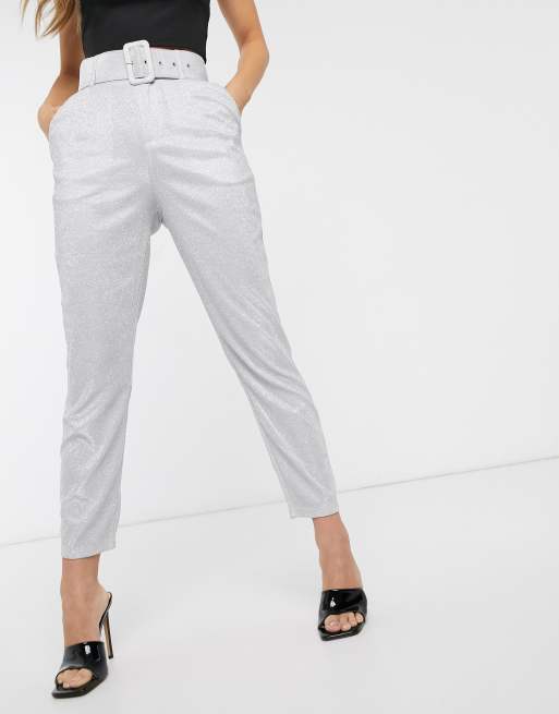Missguided belted cigarette pants in silver glitter Very well made.